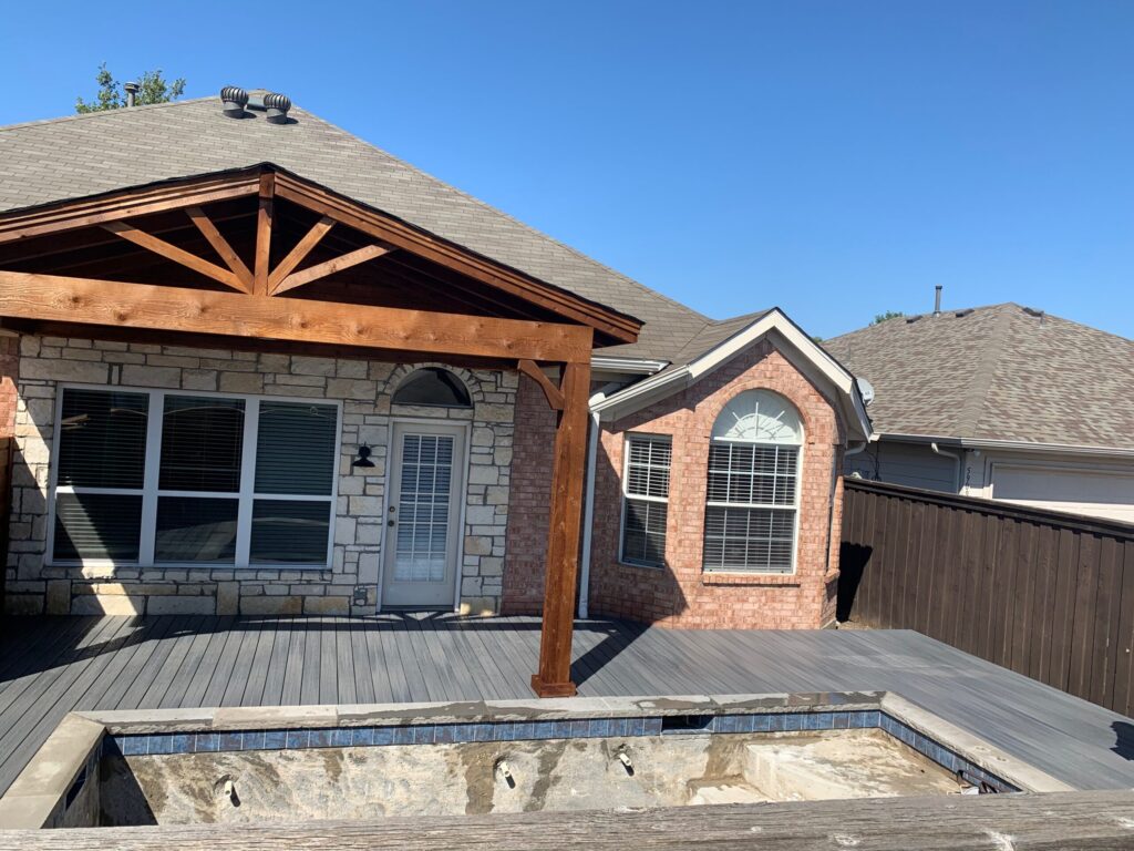 This handsome wood structure stands above a sleek, contemporary composite deck. The deck's cool gray tones provide a beautiful modern contrast to the warm cedar, while its low-maintenance, splinter-free surface is ideal for barefoot comfort around the pool. This cohesive, high-end outdoor living space, expertly constructed by North Texas Fence and Deck LLC, is a perfect Wylie retreat for relaxing and entertaining, seamlessly integrating the home with its natural surroundings.